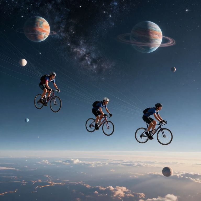Cyclists defy gravity, pedaling effortlessly across ethereal skies where bicycles float suspended by unseen threads, weaving through a cosmic tapestry of distant planets and starlit horizons.