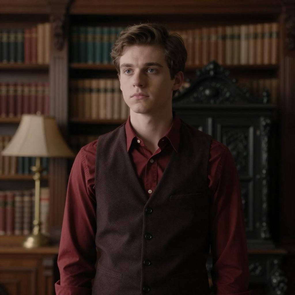 Portrait of a young man with short brown hair, wearing a dark brown vest over a red shirt, standing in a dimly lit, ornate library. The background features dark wooden bookshelves filled with books, a brass lamp, and an intricately carved black cabinet. The man gazes slightly to the left with a serious expression.
