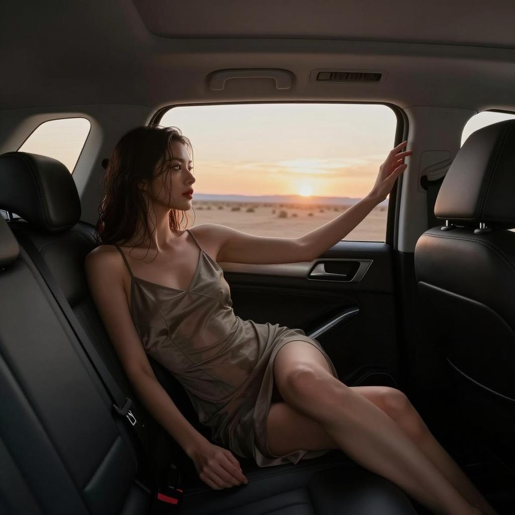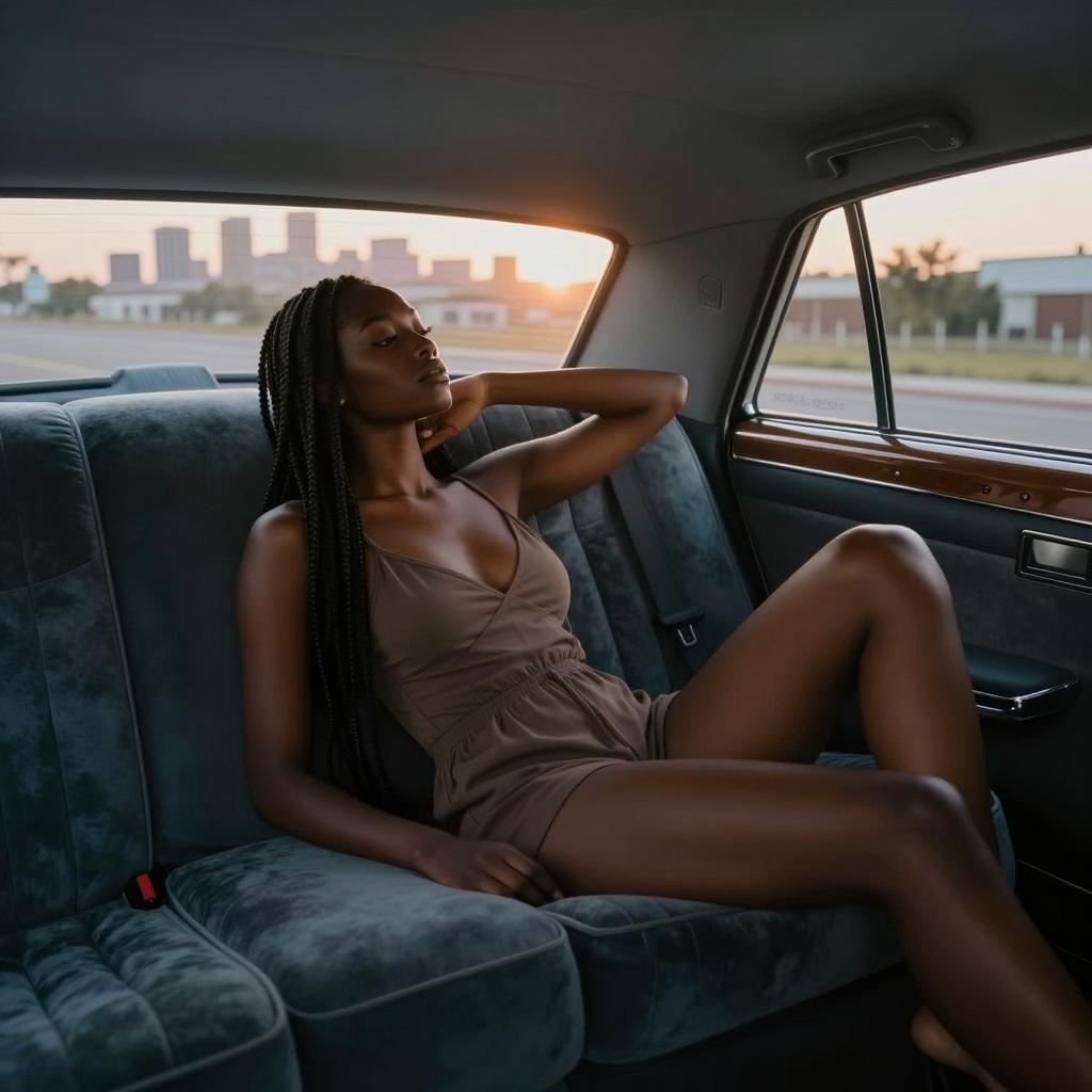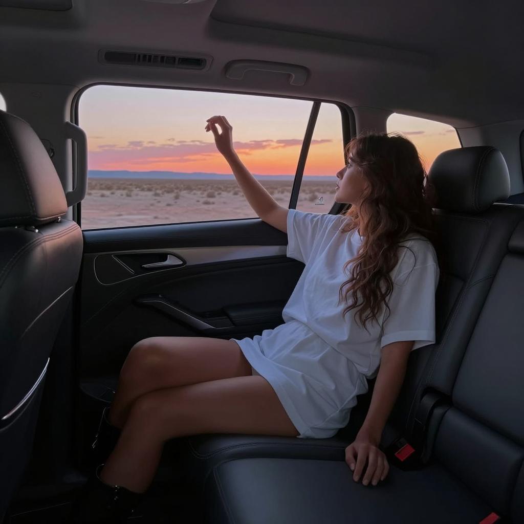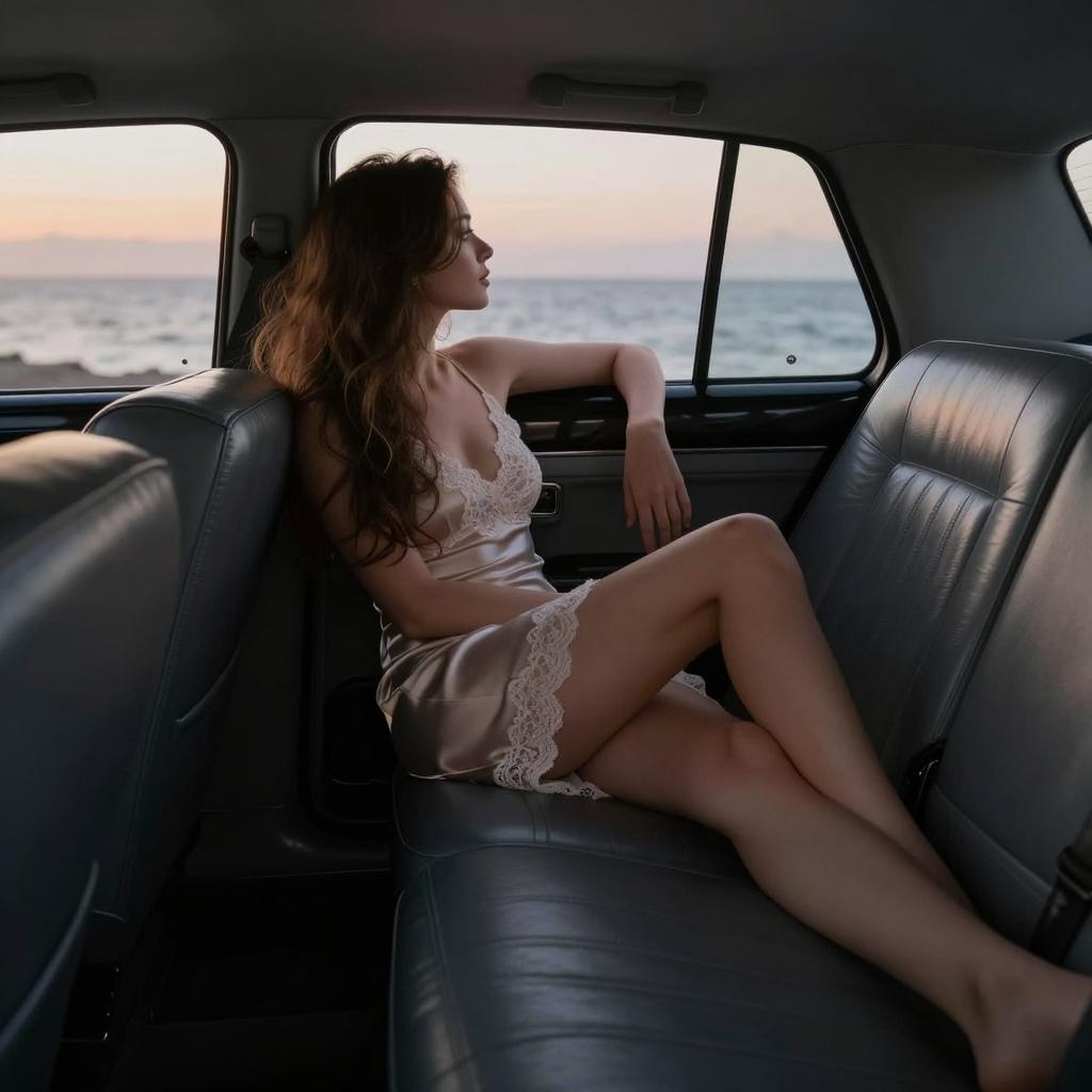 Woman in car, reclining in the backseat of old town car with velour upholstery and chrome accents wearing loose T-shirt dress draping over her legs on freckled woman with wavy hair and glossed lips, sitting sideways with legs stretched across the seat, hand tracing the window in suburban rooftops under a colorful sunset under strong backlighting from the setting sun creating silhouette edges from shot from outside the open rear door framing her and the sunset, moody cinematic backlit scene, ultra-detailed