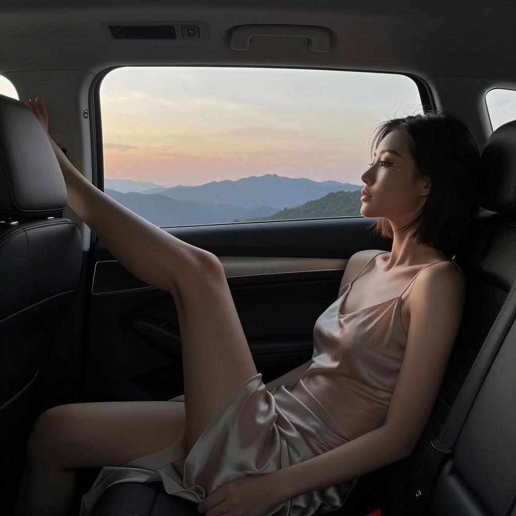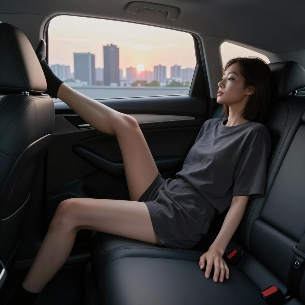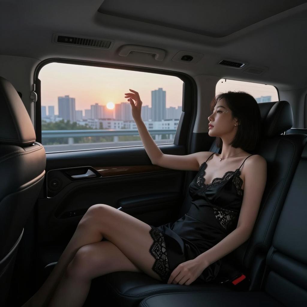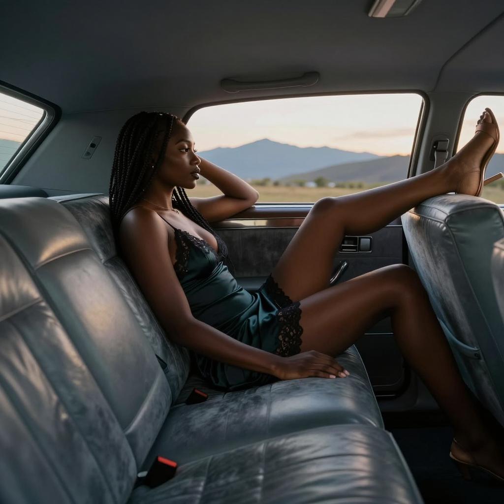 Woman in car, reclining in the backseat of old town car with velour upholstery and chrome accents wearing loose T-shirt dress draping over her legs on freckled woman with wavy hair and glossed lips, sitting sideways with legs stretched across the seat, hand tracing the window in suburban rooftops under a colorful sunset under strong backlighting from the setting sun creating silhouette edges from shot from outside the open rear door framing her and the sunset, moody cinematic backlit scene, ultra-detailed