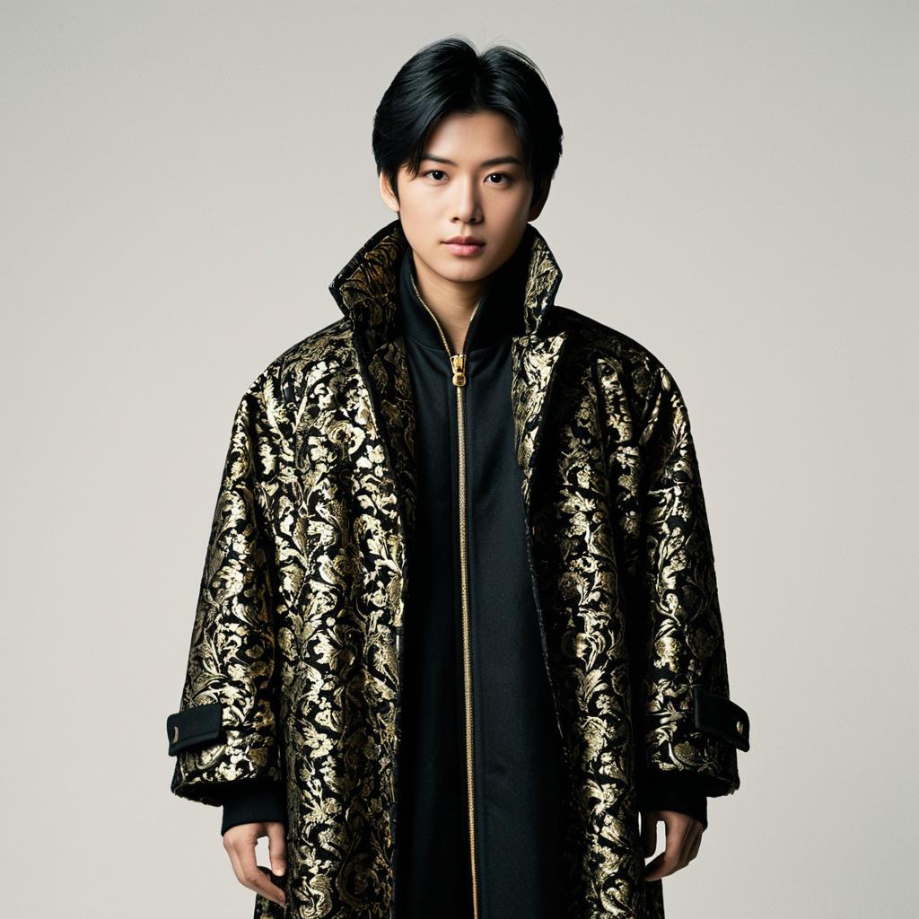 Prince coat black gold,1boy, solo, male focus, realistic, black hair, looking at viewer, long sleeves, standing, simple background, closed mouth, asian, coat