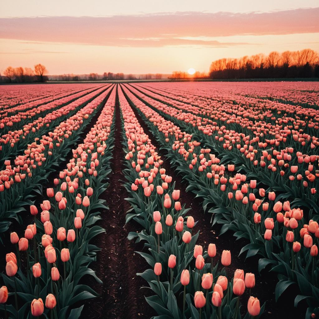 Spring sunrise in a blooming orchard, rows of flowering fruit trees, warm, gentle morning light, evocative painting