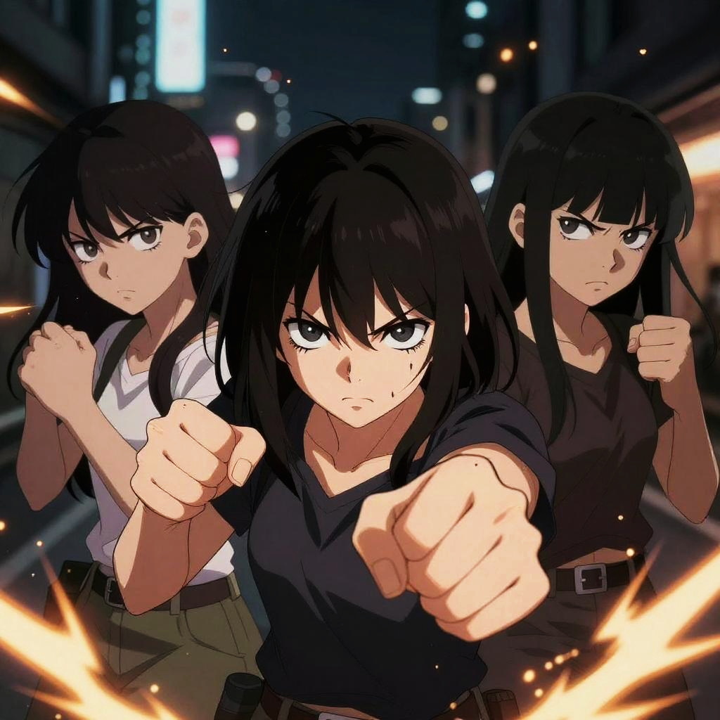 Angry anime girls shouting in a dramatic cityscape, sharp lines, bold shadows, vibrant reds and blacks, fierce energy, stylized hair and clothing blowing in the wind.