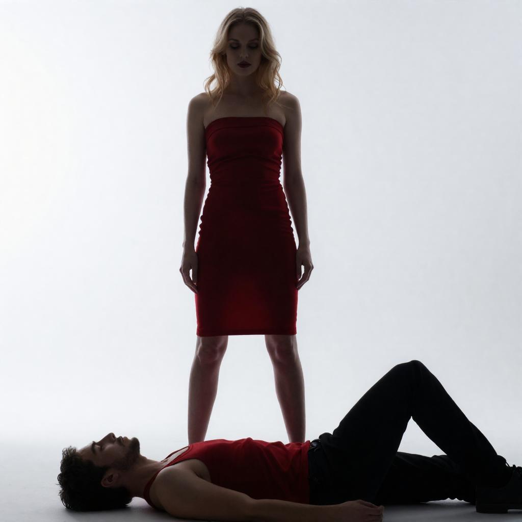 Photograph of a silhouetted woman in a strapless, red dress standing over a man lying on the ground. She has blonde hair and a slender build. The background is bright white with soft, diffused light creating a dramatic effect. The man is partially visible, wearing dark clothing.