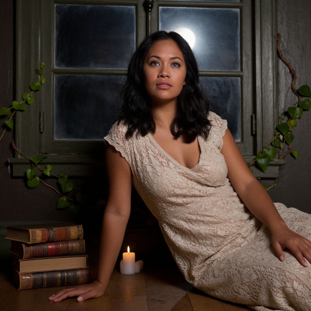 A portrait photograph captures the essence of a captivating Pacific Islander woman with soft blue eyes and dark, wavy hair that falls just below her chin. She wears a delicate lace dress that shimmers in the soft moonlight streaming through an old, ivy-covered window. Taken from a unique low-angle perspective, the image depicts her sitting on a wooden floor, surrounded by antique books and candles. The composition evokes a sense of intrigue and nostalgia, drawing attention to her enigmatic expression and flawless complexion, with meticulous attention to texture and detail.