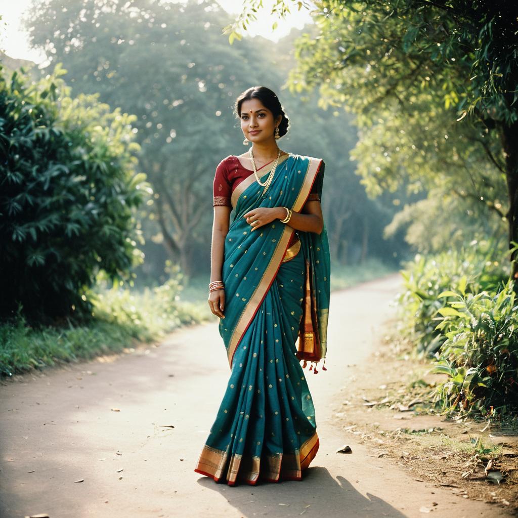 A photograph of a 29-year-old Indian woman in 2005, wearing traditional sari, posed in soft morning light, captured with Hasselblad medium format camera, 80mm lens, full body, photo-realistic, editorial photography