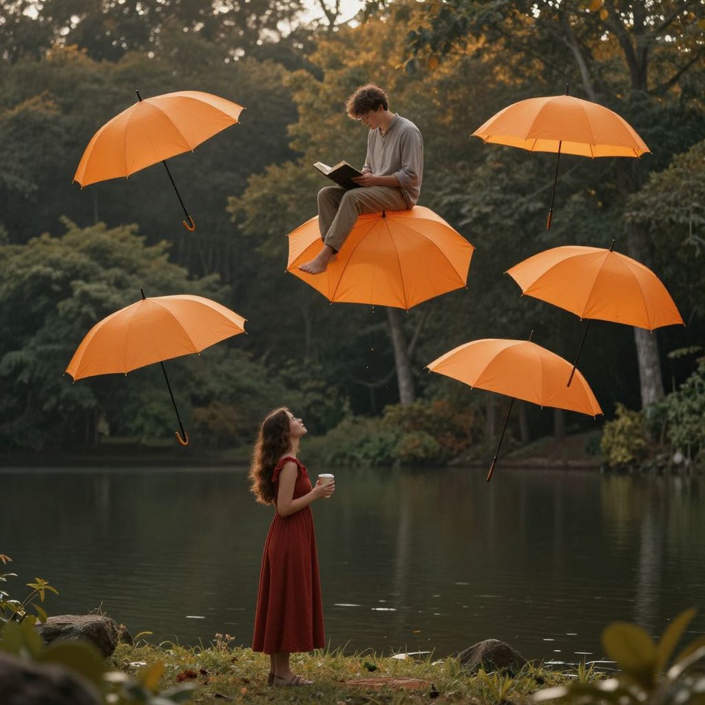 Sentient orange umbrellas float gracefully above a tranquil forest lake, illuminated by soft golden light, as a man sits serenely atop one, reading a book while a woman in a red dress stands below, holding a cup, gazing upward in wonder.