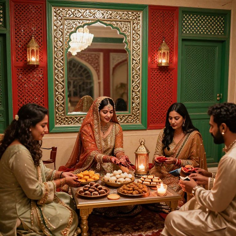 Pakistani wedding prompt: A serene yet festive wedding setup in a heritage house with intricate mirror work, red and green lattice walls, and guests enjoying hand-painted sweets, with a traditional henna night illuminated by soft lanterns and candlelight.