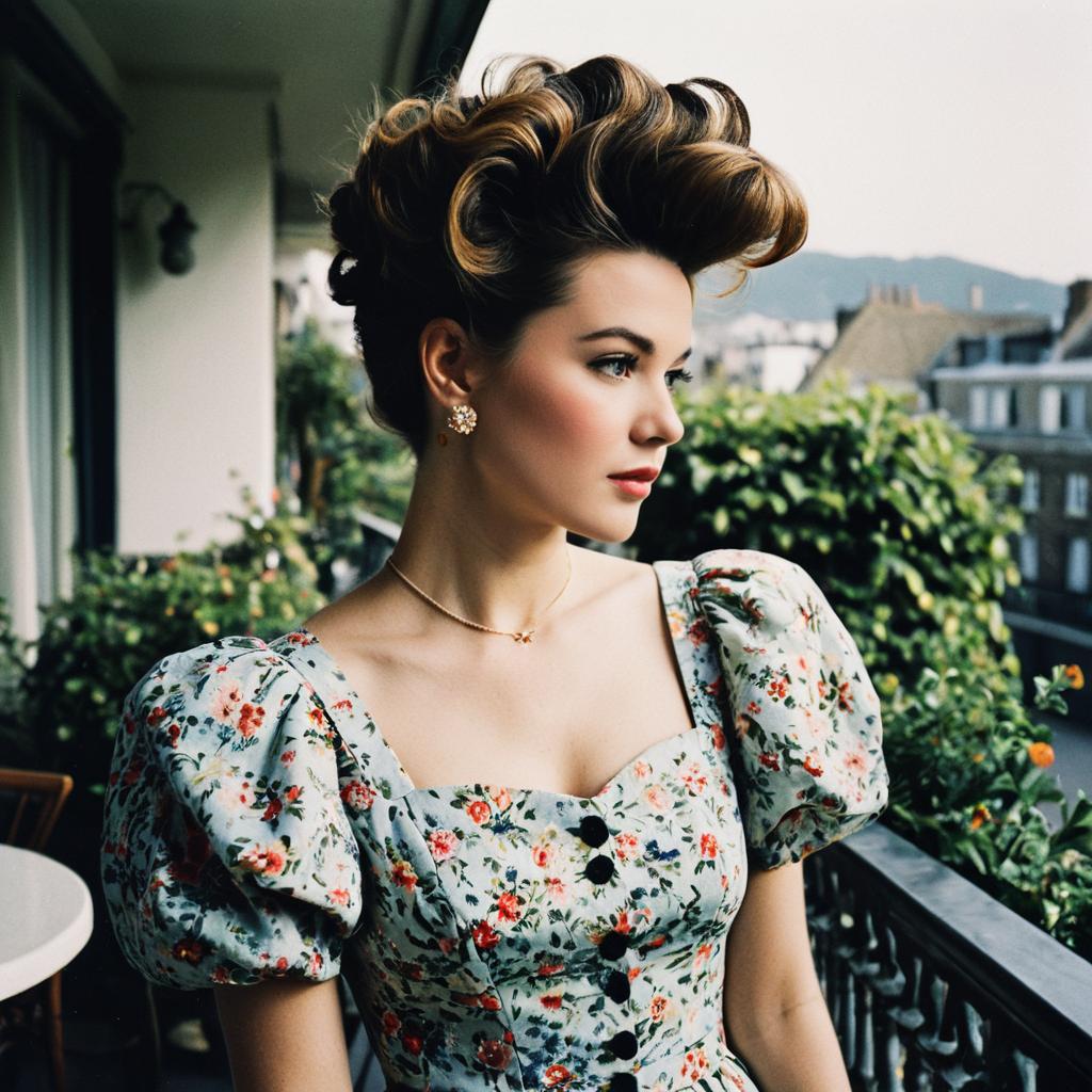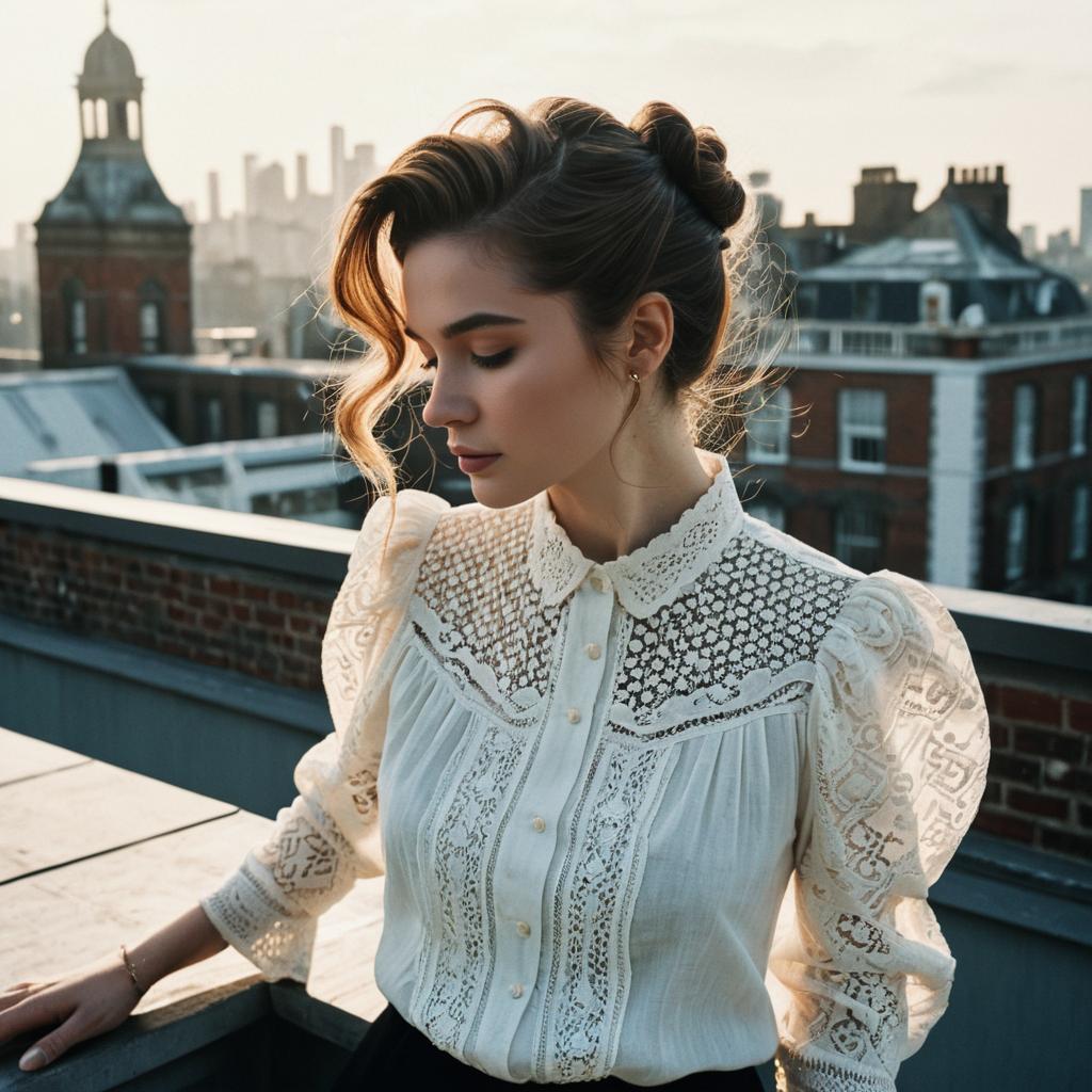 Ivy League hairstyle on fashion model, wearing elegant dress, in rooftop garden, captured in fashion editorial style with golden hour light.