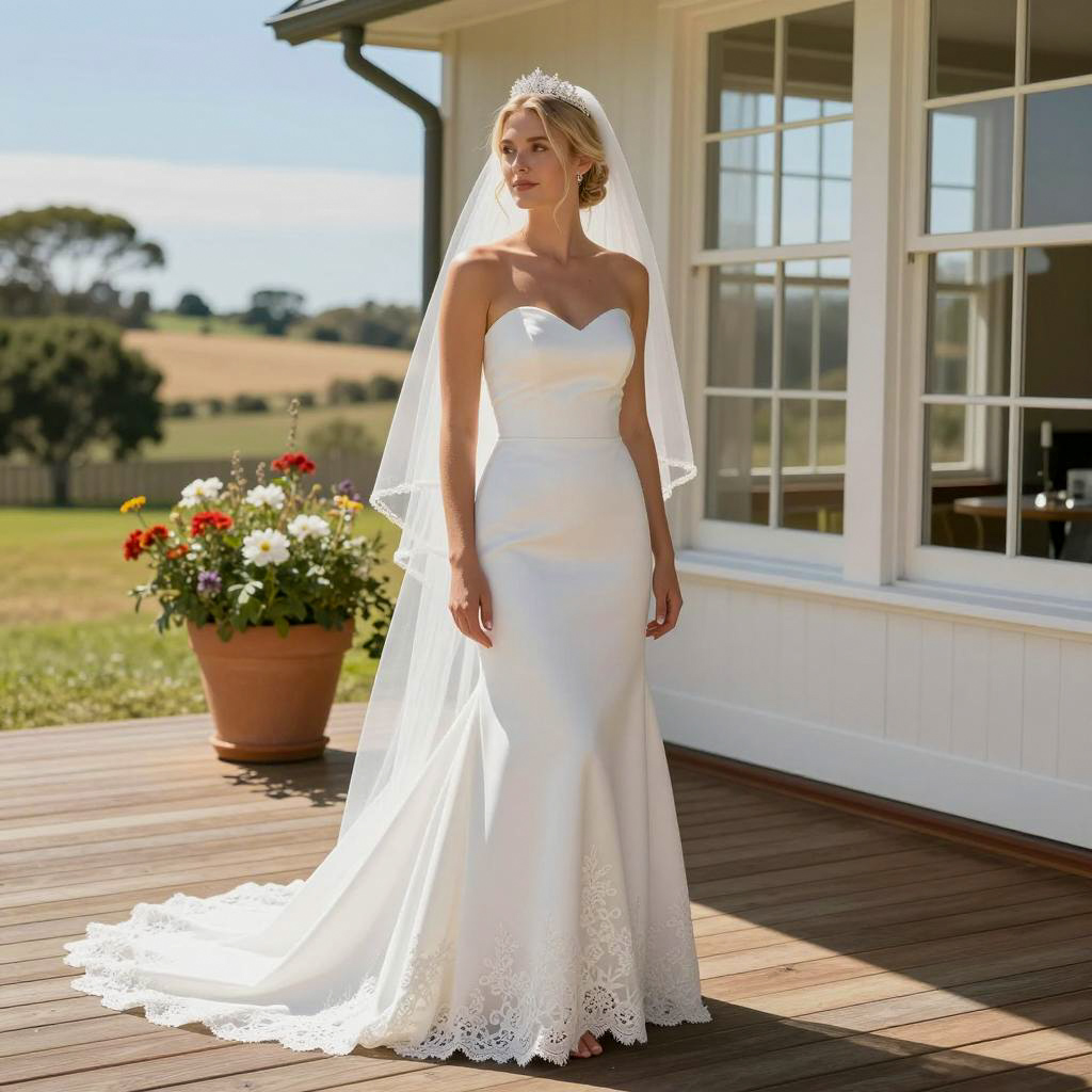 Bride costume australia, photorealistic wedding photo, young blonde woman, white strapless wedding dress with lace hem, white veil with crown, standing on wooden patio, sunny day, background with large windows, potted flowers, summer, clear sky, casual pose, soft natural light, outdoor setting, elegant, serene expression, bare feet, long dress, lace details, traditional wedding attire, summer wedding, relaxed atmosphere, daytime.
