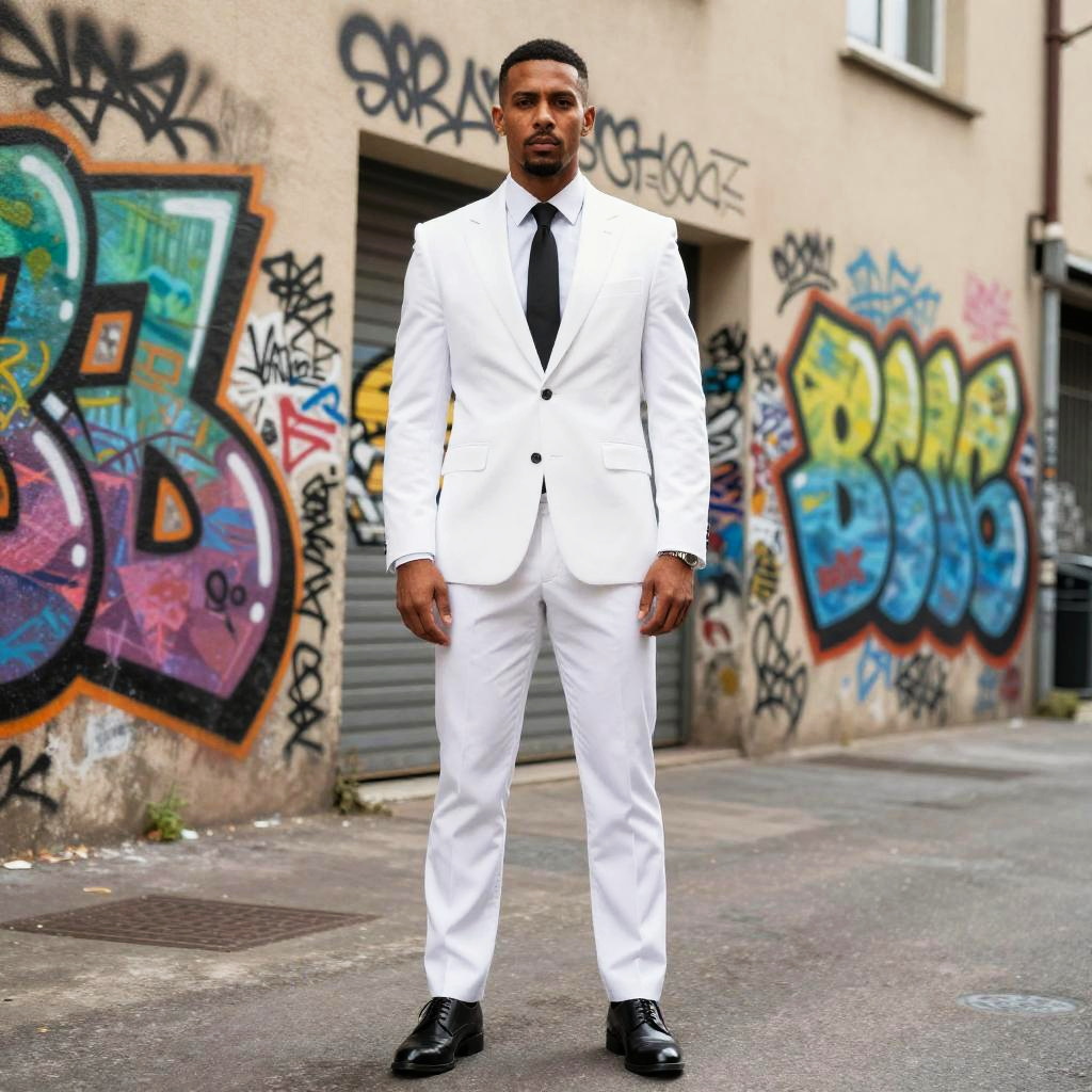 An artistic portrayal of a well-dressed man standing confidently in an urban alleyway, with walls adorned by vivid graffiti art. His sharp white suit juxtaposed against the colorful street art creates a striking visual contrast.
