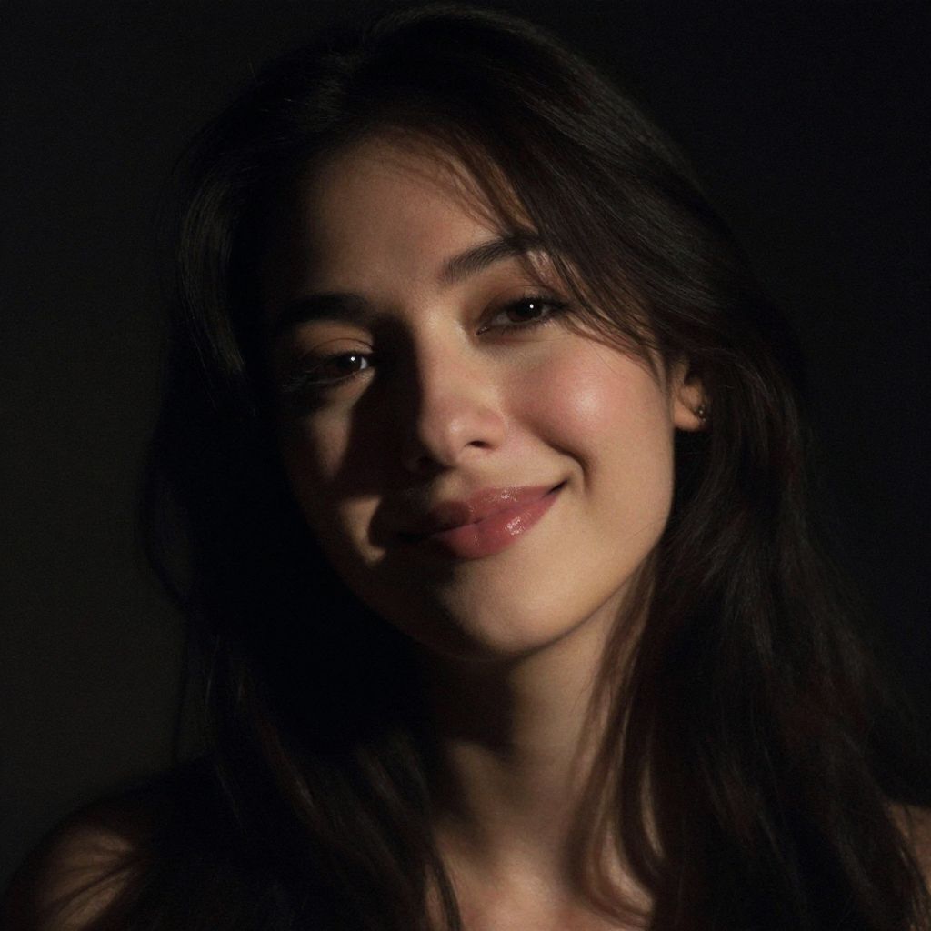 Photograph of a young woman with long dark hair, soft smile, and glossy lips, illuminated against a dark background.