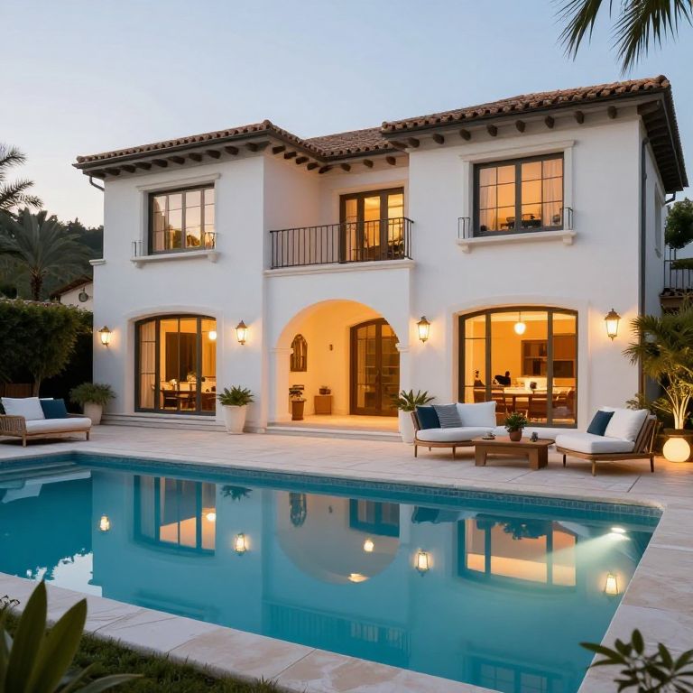 Luxurious estate featuring a serene poolside retreat with a two-story Mediterranean-style home, warmly lit interiors, and an inviting outdoor lounge area complete with plush seating and ambient lighting.