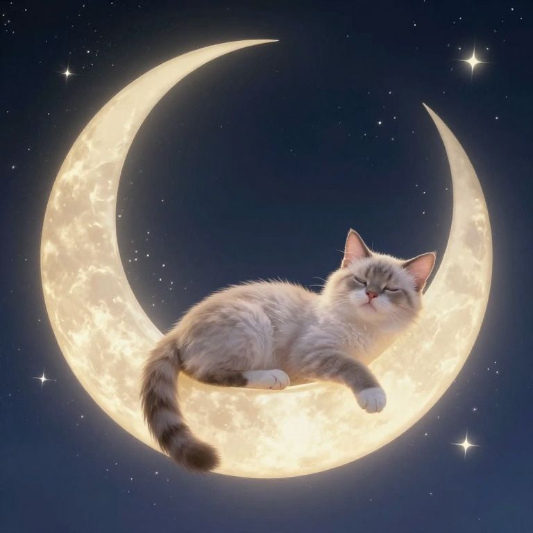 In a realm where dreams and reality intertwine, a celestial cat rests serenely atop the crescent moon, cradled by the gentle hum of stardust whispers and the soft glow of cosmic hope, embodying the eternal dance between rest and wonder.