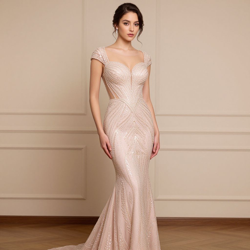 "Woman, sophisticated evening wear, fitted mermaid gown in blush pink, intricate gold beading and sequin embroidery, sheer cap sleeves, sweetheart neckline with a sheer overlay, keyhole back, flared hem with a slight train, updo hairstyle with subtle earrings, light makeup, elegant indoor setting with decorative wall paneling. Sexy. Pretty face and beаutiful eyes. Big breasts."