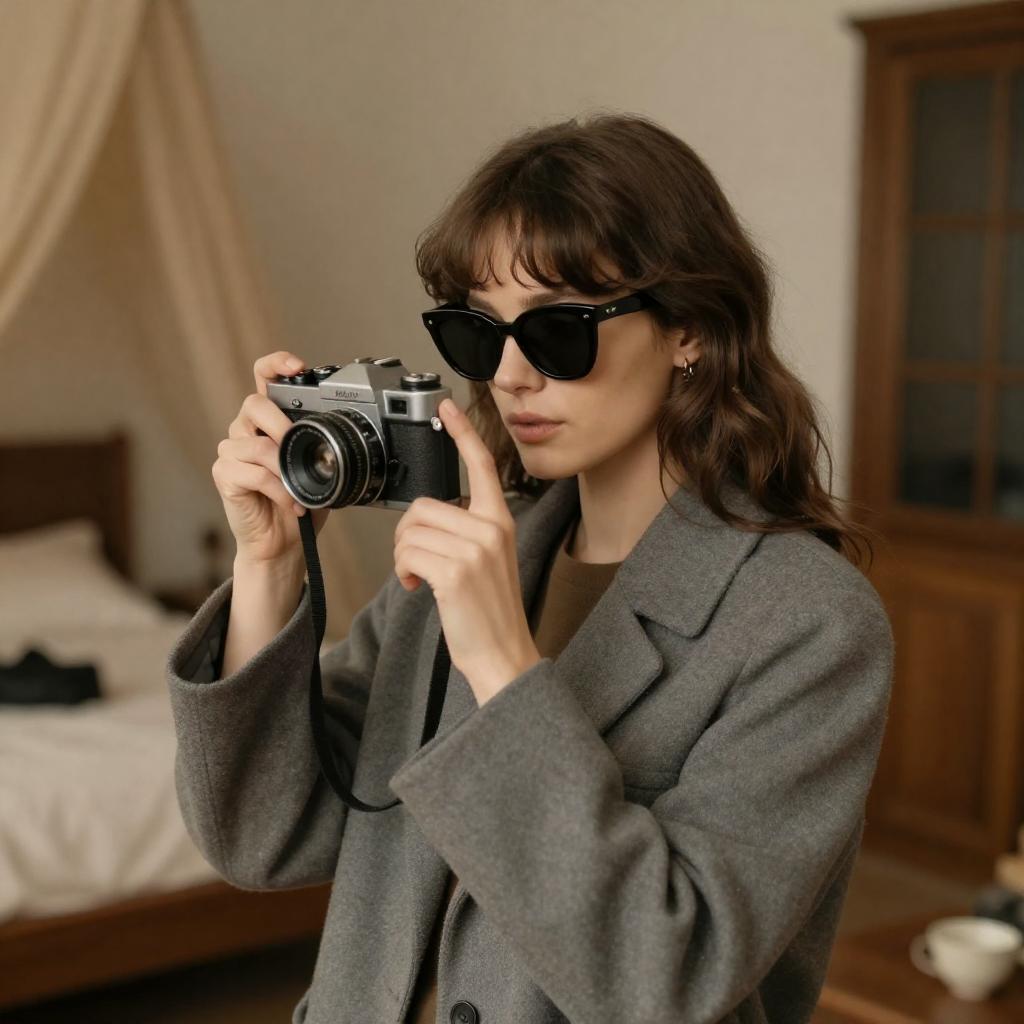 Woman with brown hair, bangs, and black sunglasses, wearing a grey coat, holding a vintage camera. Indoor setting, dim lighting. Background includes a bed with beige curtains and wooden furniture. She looks focused, adjusting the camera. Warm, vintage atmosphere.