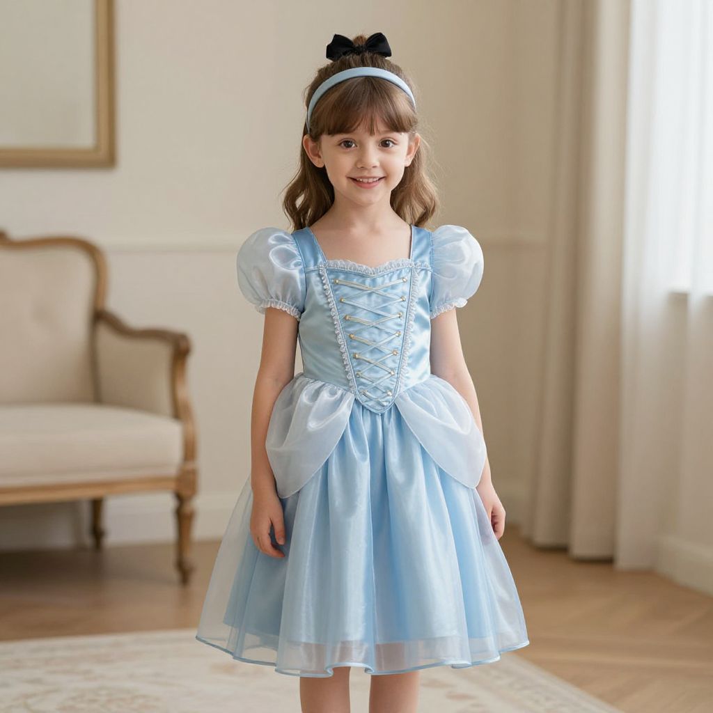 Photograph of a young Caucasian girl with light brown hair, wearing a light blue, satin, puffed-sleeve, square-neck, lace-up, knee-length dress with a sheer overlay. She has a white headband with a black bow and a gentle smile. The background features a softly lit, elegant room with cream-colored curtains, a wooden-framed chair with cream upholstery, and a light-colored wall. The floor is wooden with a small, patterned rug visible at the bottom. The overall style is classic and delicate, evoking a fairy-tale-like appearance.