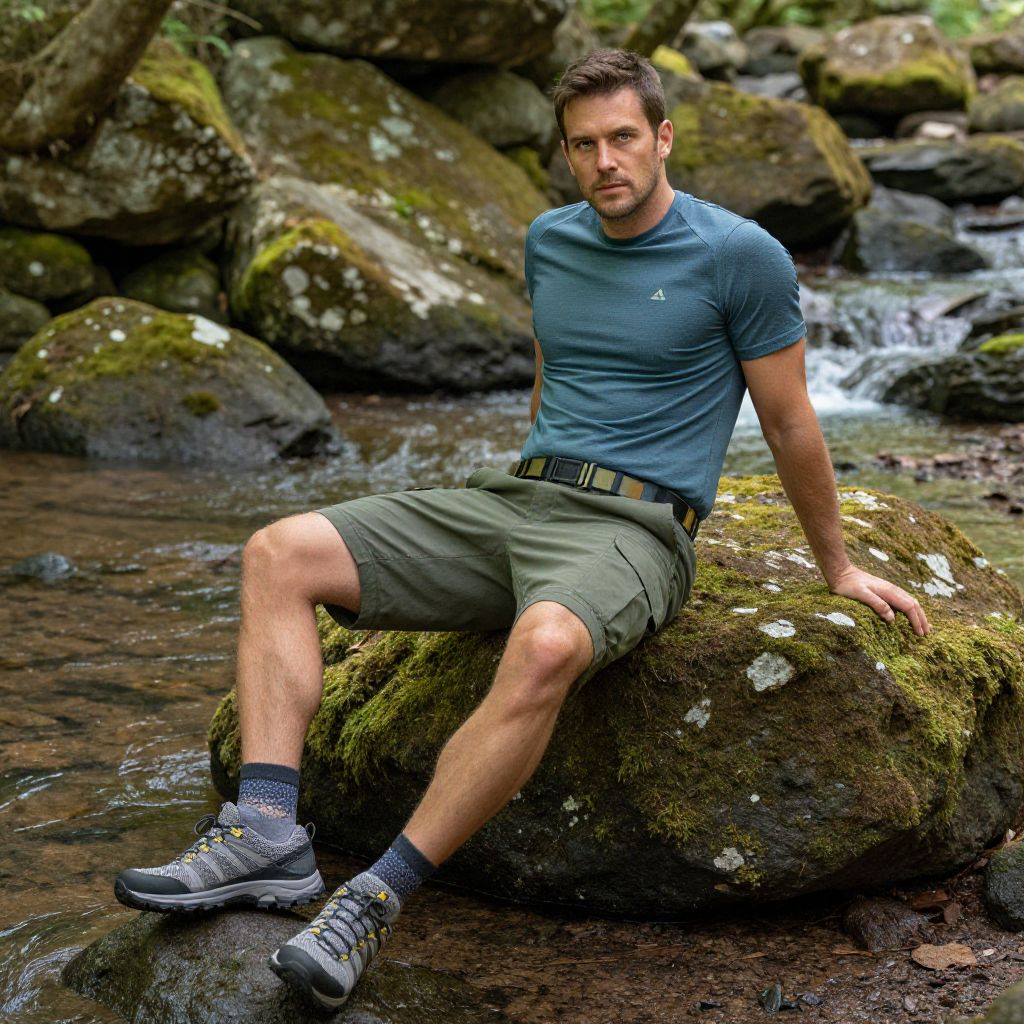 A man, lightweight moisture-wicking UV protection shirt, cargo shorts in olive green, breathable mesh hiking shoes, quick-dry nylon socks, durable nylon belt, secluded forest clearing, moss-covered stones, gentle stream nearby, natural light, relaxed expression. Man has masculine face and piercing eyes