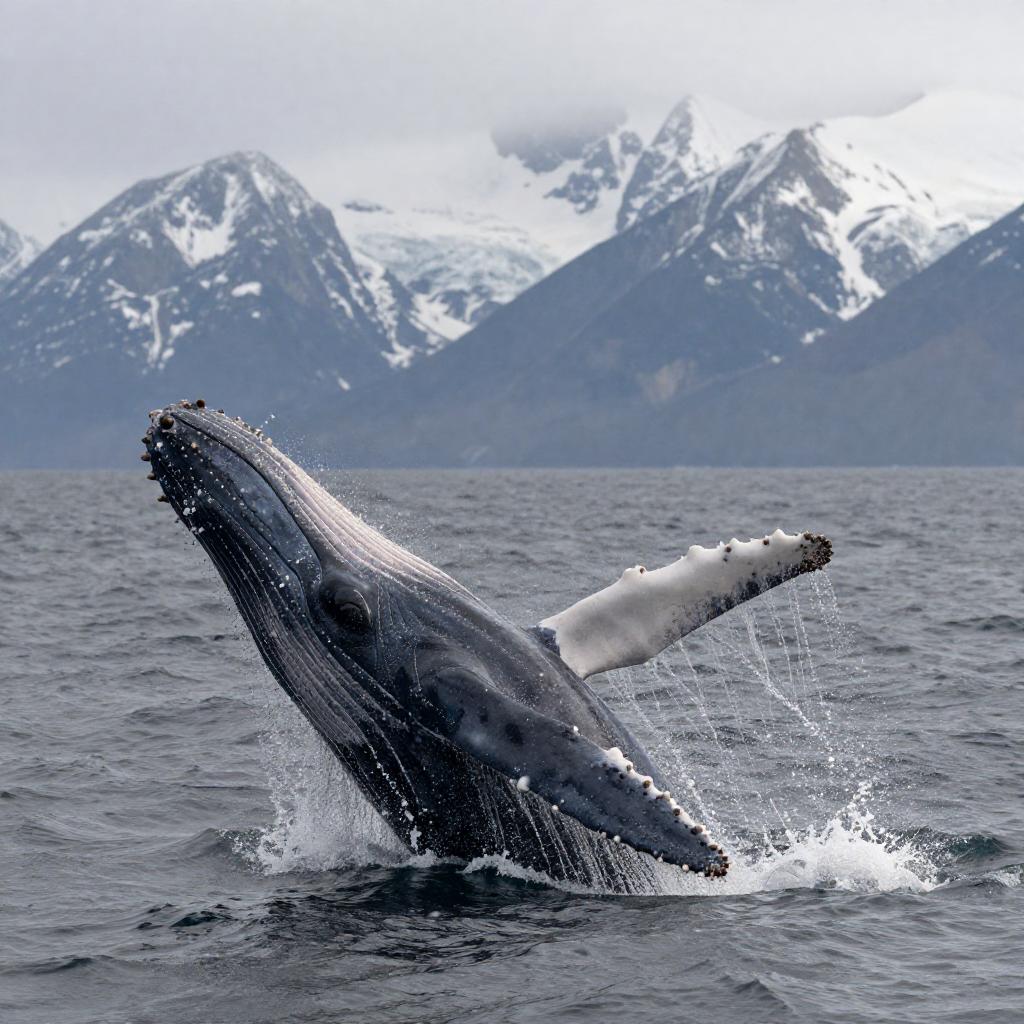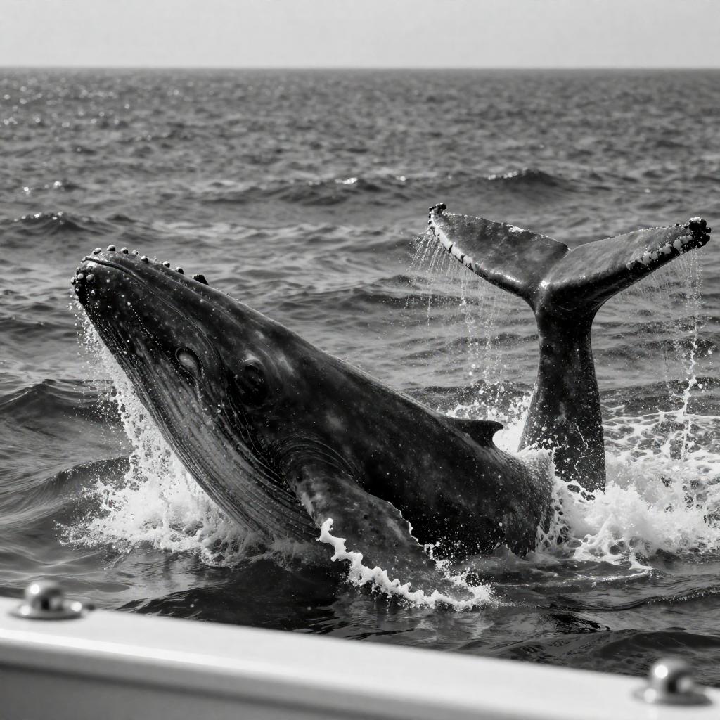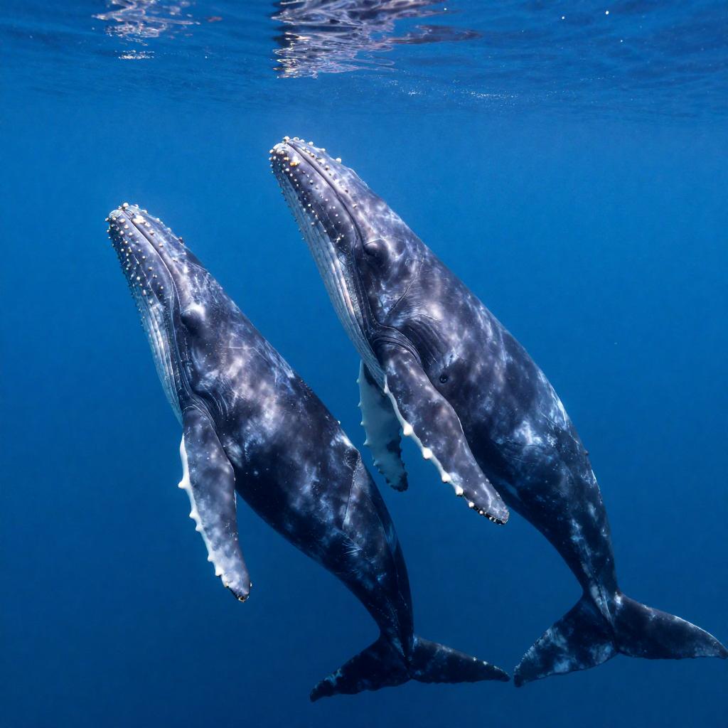 Photograph of two large humpback whales swimming underwater in a vivid blue ocean. The whales are positioned side by side, with their dark, ured bodies and white underbellies visible. Light reflections create shimmering patterns on their skin. The background is a clear, bright blue, emphasizing the depth and clarity of the water.