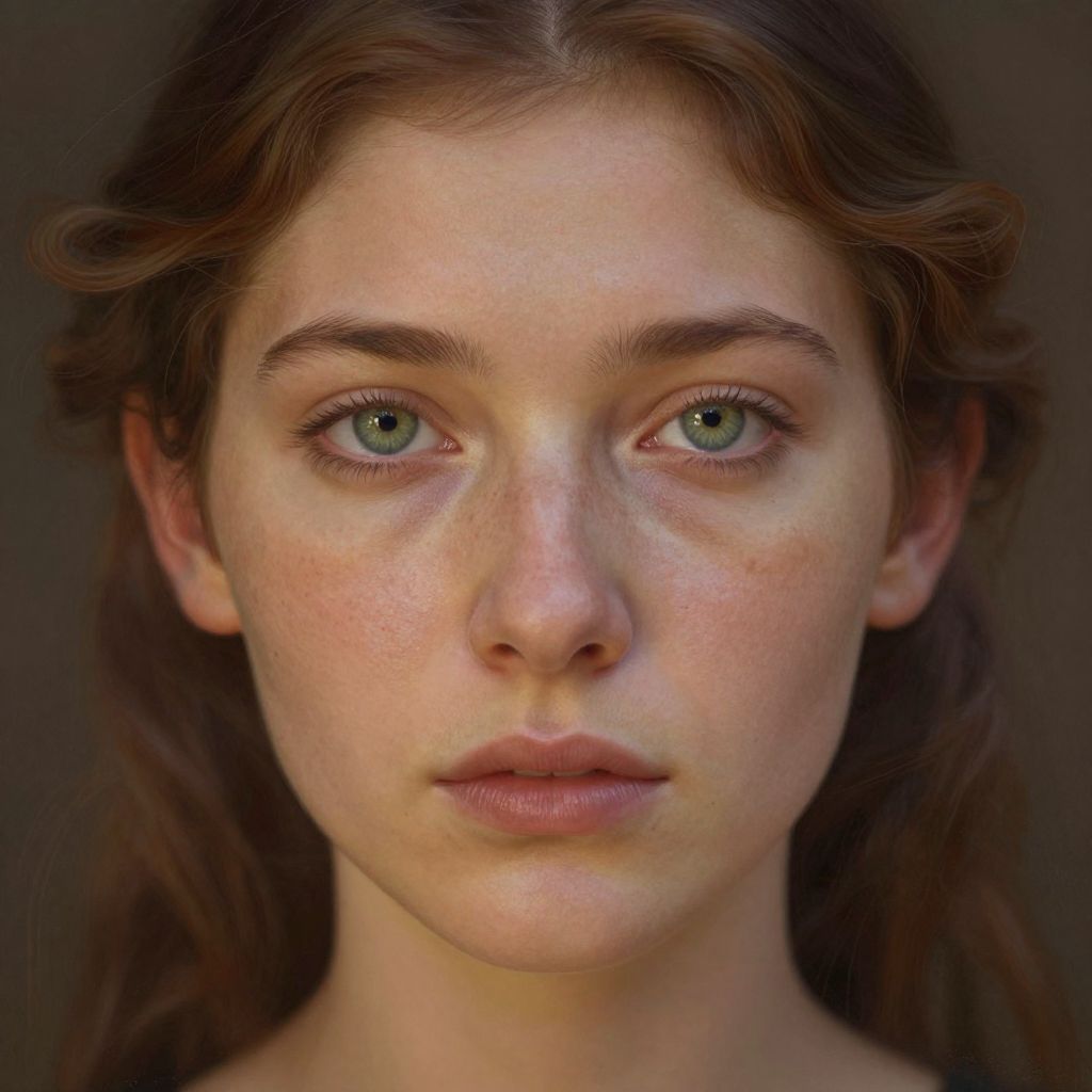 A DSLR portrait captures an Andean woman's enigmatic gaze; her misty green eyes stand out against porcelain skin. Her hair, styled in soft waves, frames her face. Viewed through a macro lens' unique angle, intricate details emerge—delicate freckles scattered across her nose and cheeks. Soft, golden light from below illuminates her features, casting gentle shadows that enhance the sculptural quality of her visage. This captivating image seamlessly blends high-resolution digital painting with an atmospheric mood, evoking introspection and curiosity as her expression suggests both vulnerability and strength.