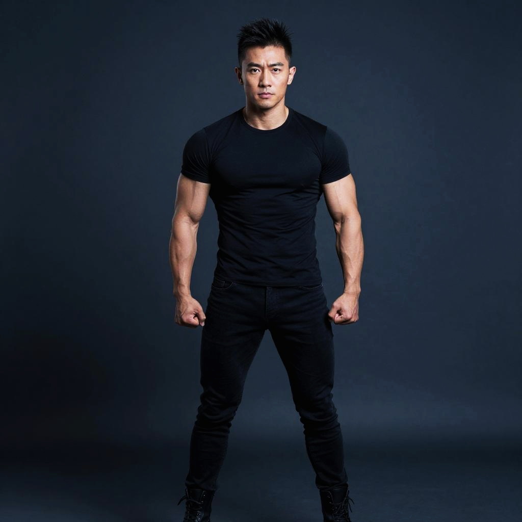 Portrait of a muscular Asian man standing confidently against a dark blue background. He is wearing a tight black t-shirt that emphasizes his well-defined biceps, paired with black jeans and black lace-up boots. His fists are clenched at his sides and he has a serious expression, highlighting his strong and sharp facial features. The lighting accentuates his toned physique and sharp contours.