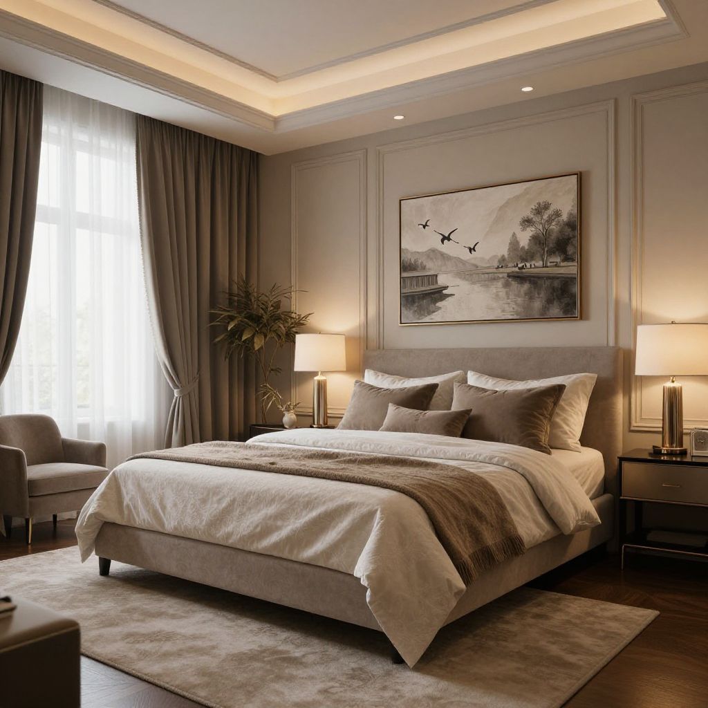 How to use MidJourney for interior design: a luxurious bedroom with elegant furnishings, plush fabrics, warm lighting, and carefully curated art pieces, illustrating how AI can inspire sophisticated and comfortable home environments.