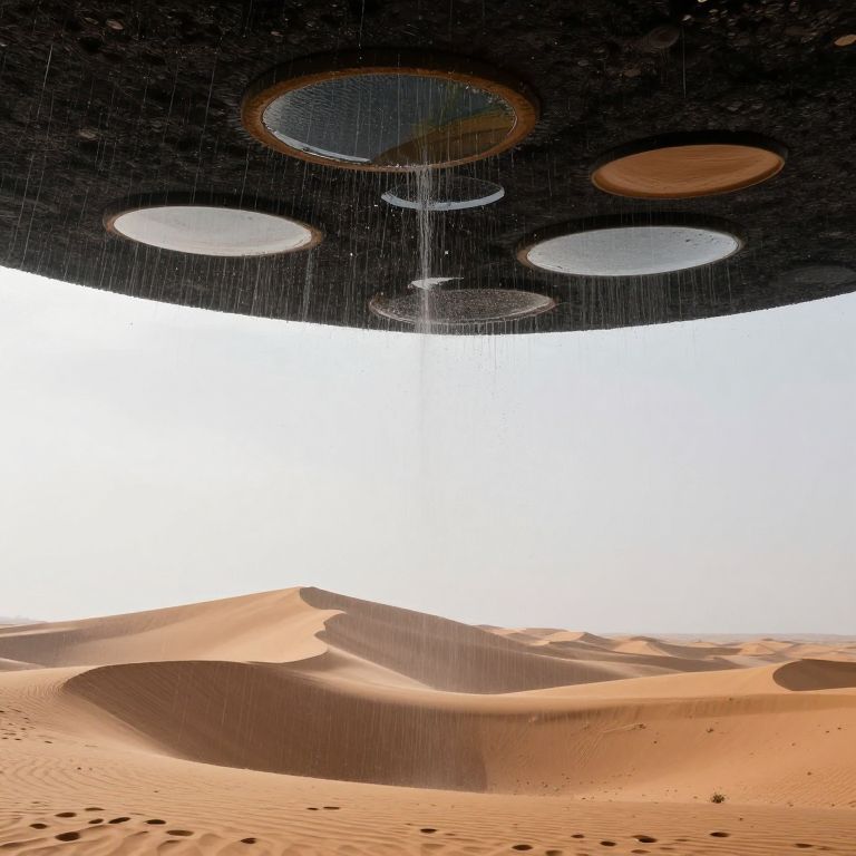 Photograph of a futuristic, black dome with multiple circular windows, raining down on a vast, sunlit desert landscape. The dome's windows are of different sizes and have a metallic sheen. Below, the desert features numerous sand dunes with intricate, wind-sculpted patterns, and a bright, white sky in the background. The raindrops are visible, falling straight down from the dome, contrasting with the arid, sandy terrain. The image combines elements of science fiction and natural desert scenery, creating a striking, surreal visual effect.