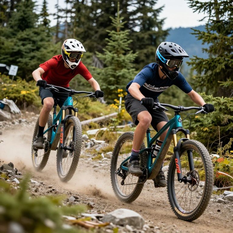 Assemblage Two teenage boys downhill mountain biking in Whistler, BC. Very fast. Photorealistic, 4k.,