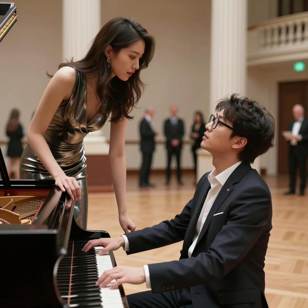 Two people at a grand piano in an elegant hall. Woman in shiny, metallic dress leans forward, holding piano edge. Man in dark suit with glasses, white shirt, leans back, gripping piano bench. Background includes blurred people and tall columns. Man looks at woman intently.
