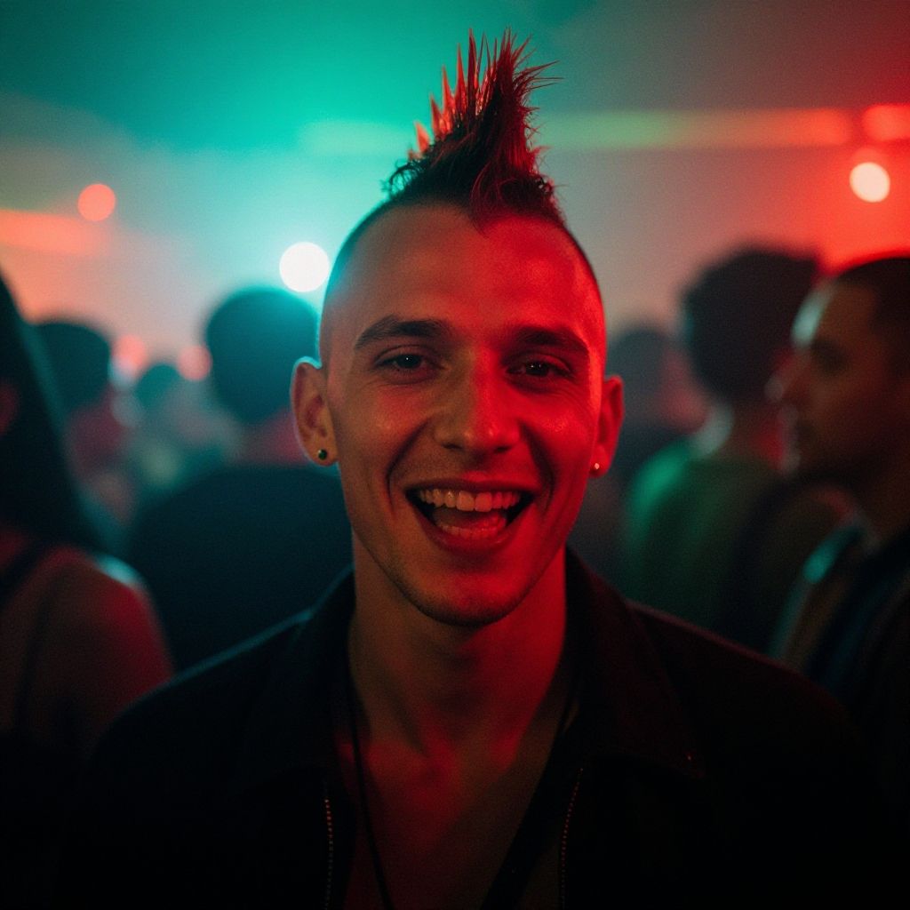 (realistic analog style sharp focus 8k raw photo with soft lighting and high quality:1.1), (hdr film grain:1.2), (cyberpunk, light flare:1.3), looking at viewer, man at a rave, seductive, red green blue, mohawk, laughing