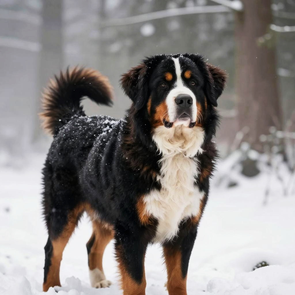 A Cane Bernese running freely through a lush green meadow filled with wildflowers under a bright summer sky, the dog's fur flowing in the wind, illustrating energy, joy, and the calm strength typical of this mountain dog breed.
