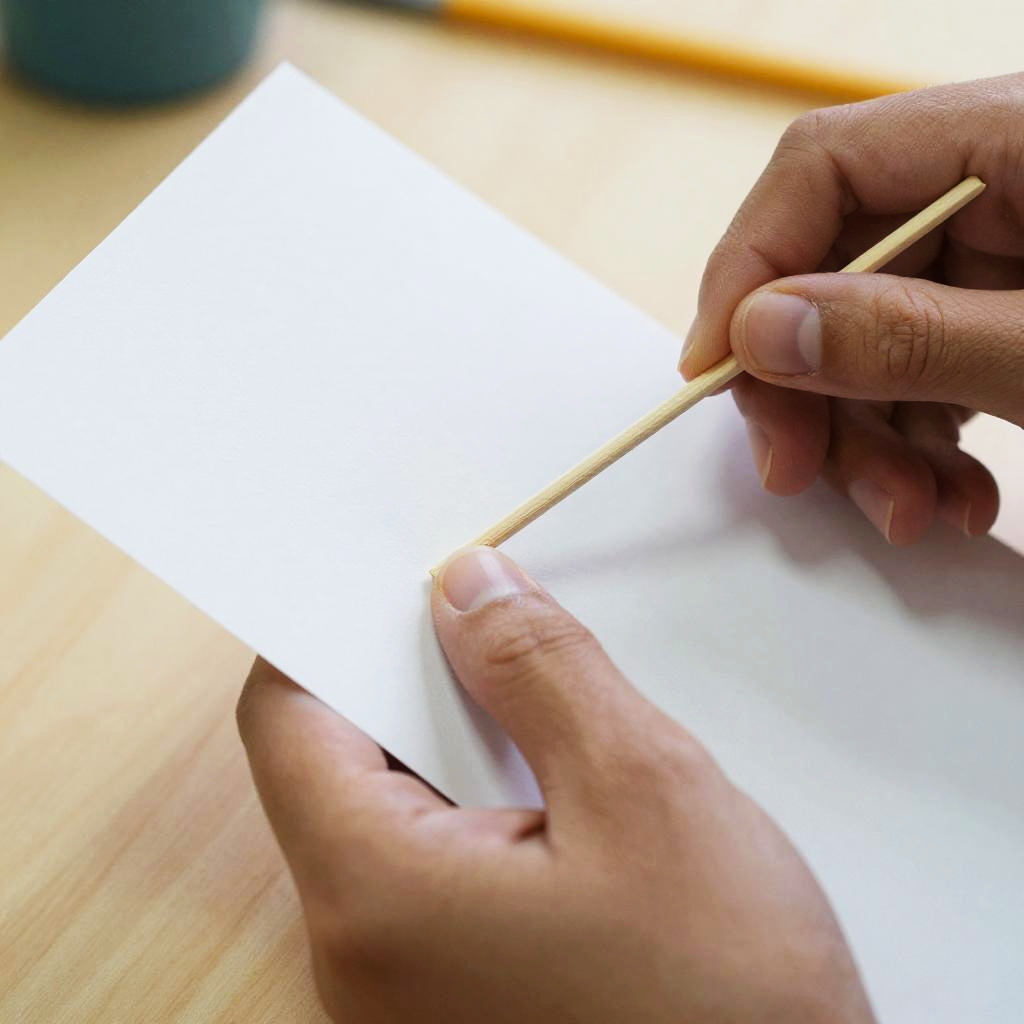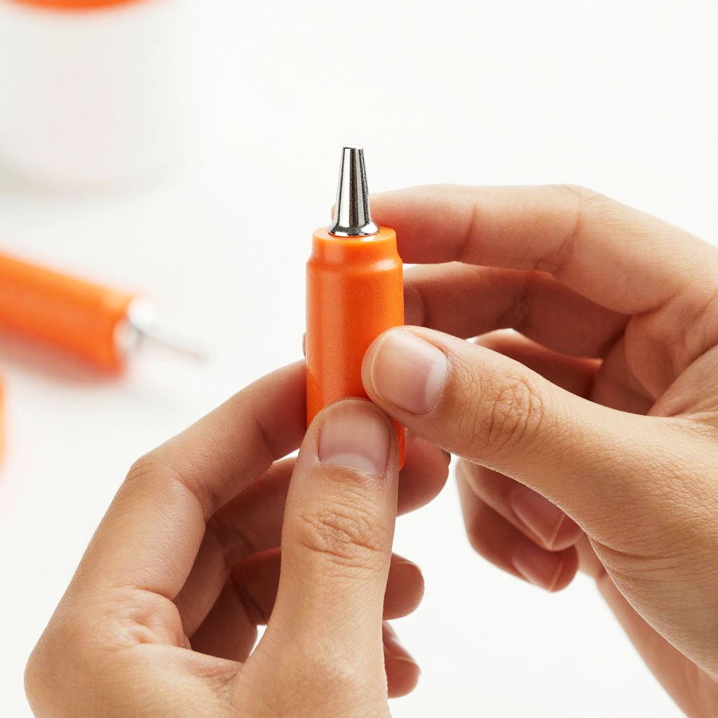 A close-up photograph shows a pair of hands with light skin tone, neatly trimmed nails, and slightly glossy fingers. One hand is gently pressing a small, blue, textured object against a smooth, light blue surface. The background is blurred, focusing attention on the hands and the object. The lighting is bright, highlighting the texture and contours of the hands and the object.