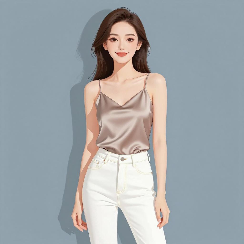 Woman with pretty face and pretty hair. smiling Woman, contemporary chic, black satin camisole with thin straps and a draped v-neckline, A-line mini skirt with shimmering gold sequin embellishments, delicate gold pendant necklace, natural wavy hairstyle, plain gray studio background. --sref 1467