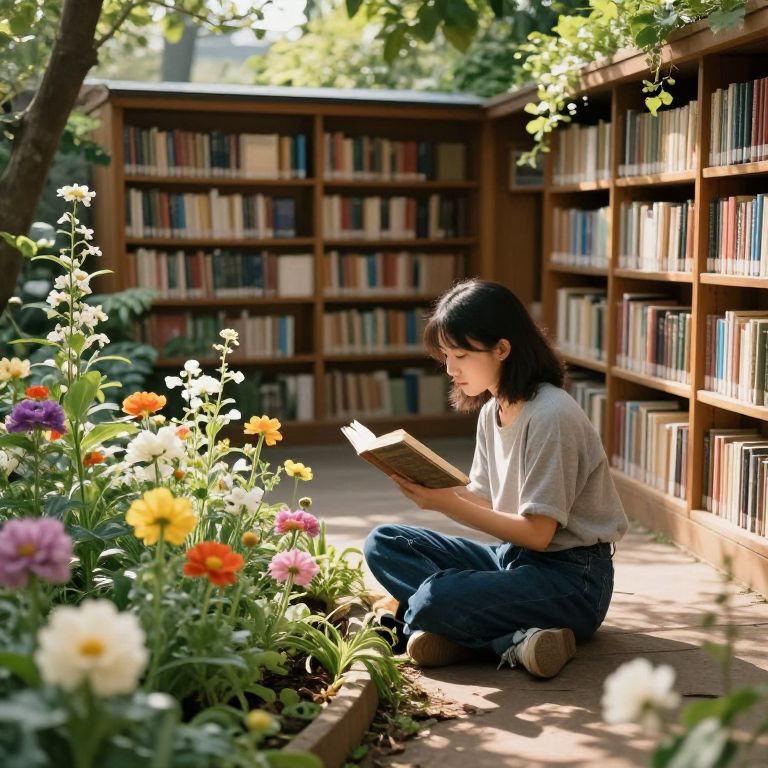 Photograph of an Asian woman with long black hair, wearing a white t-shirt and blue jeans, sitting cross-legged on a sunlit path in a serene library garden. She is intently reading a book. The path is lined with vibrant flowers, including daisies and marigolds, on the left. Tall wooden bookshelves filled with books frame the background on both sides, partially shaded by overhead green leaves. Soft sunlight filters through the trees, casting gentle shadows. The woman's relaxed posture and the tranquil setting evoke a sense of peaceful concentration and natural beauty.