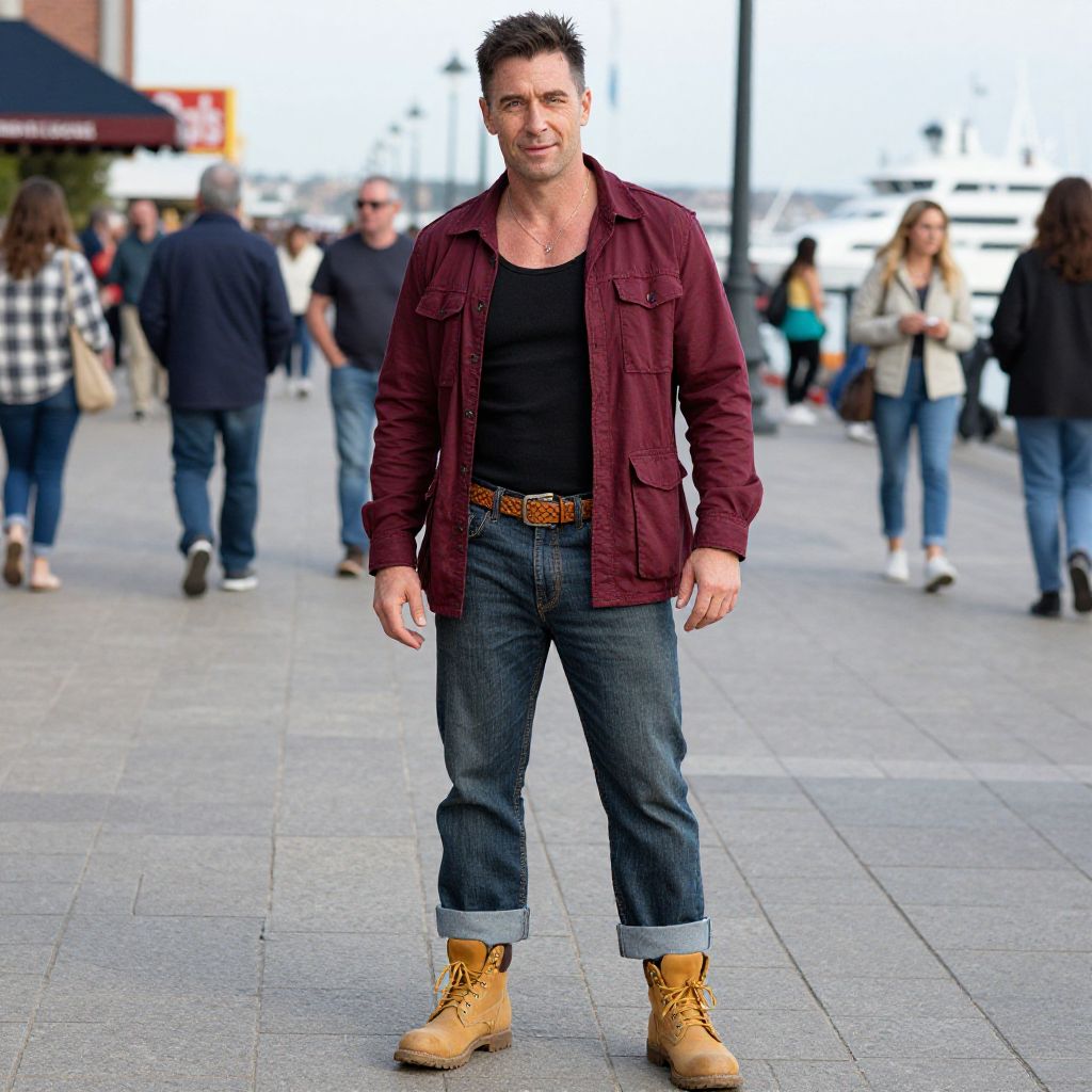 A man, light gray performance t-shirt, olive green field jacket, beige cargo shorts, black athletic shoes, vibrant stalls, colorful produce, bustling crowds, disposable camera style, relaxed smile, casual confidence. Man has masculine face and piercing eyes