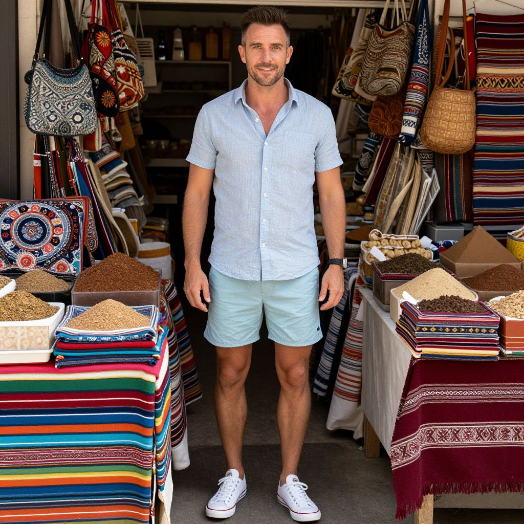 Photograph of a young man with short dark hair, olive green jacket, white t-shirt, beige shorts, and black sneakers, browsing a vibrant outdoor