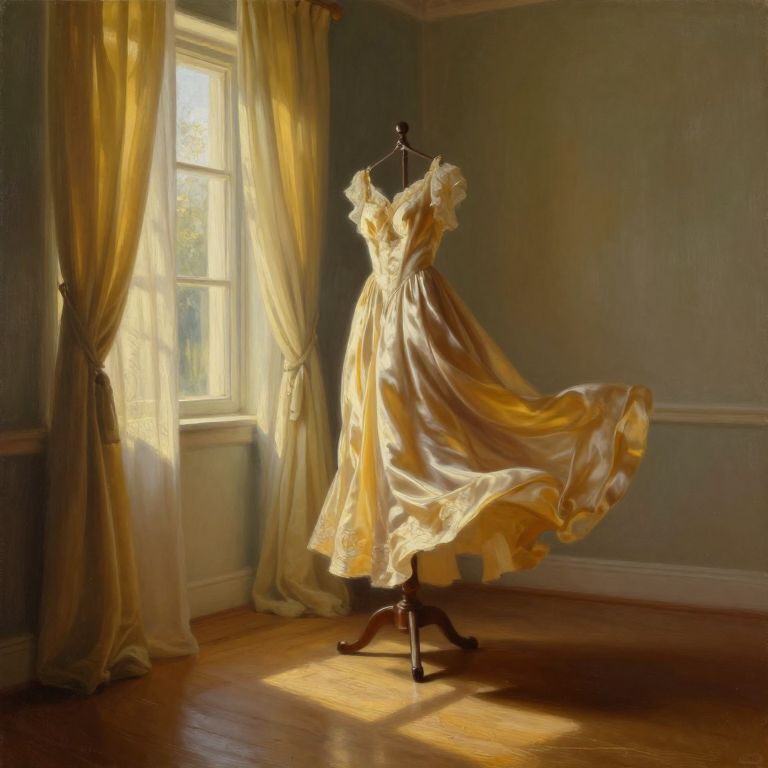 A mesmerizing oil painting captures a tranquil room illuminated by golden sunlight filtering through sheer draperies, evoking an atmosphere reminiscent of a master artist's deft manipulation of light and color. The scene unfolds from an intimate 'worm's-eye view', focusing on an exquisite, intricately woven silk dress swaying gently near the center, suspended from a coatstand. The fabric seems to come alive as it dances gracefully in the soft breeze from an open window, casting elongated shadows across the polished wooden floor. As the light tenderly caresses every crease and contour of this captivating garment, viewers are drawn into a moment of contemplation, invoking a sense of desire for the tale that unfolds just beyond our sight.