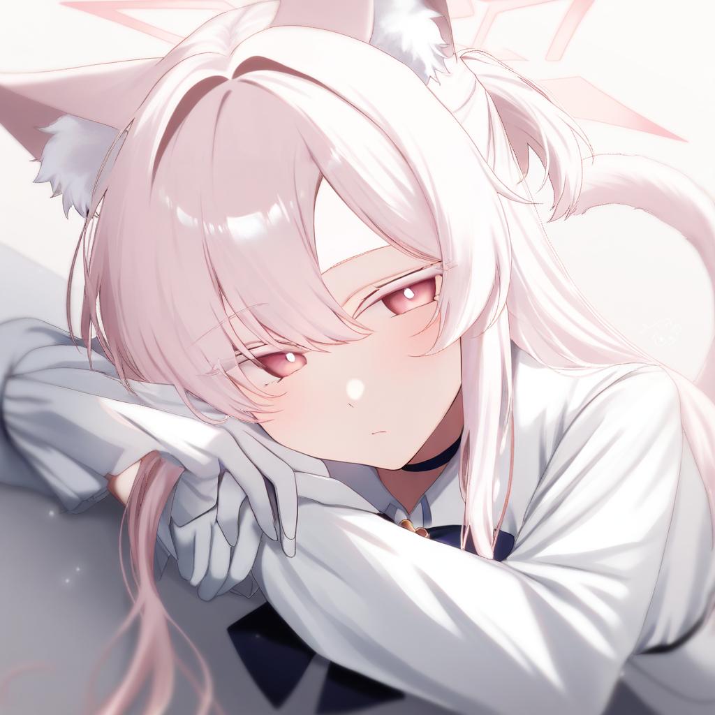 Digital anime-style illustration of a cat girl from Blue Archive with white and pink hair, red eyes, and animal ear fluff. The character wears a white shirt and gloves, a black choker, and has a pink halo above her head. She has long hair and a cat tail, depicted in a soft, detailed color palette.