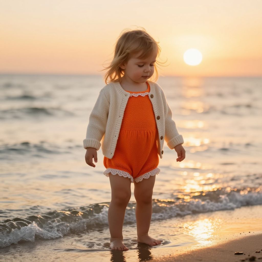 A young toddler girl standing barefoot at the edge of the ocean during golden hour. She is wearing a playful orange knitted romper with lace trim and a cream-colored knitted cardigan with wooden buttons. Her long blonde hair flows gently in the breeze as warm sunlight bathes the scene, casting soft orange and yellow tones across the water and highlighting the delicate textures of her clothing. The background features calm ocean waves under a glowing sunset sky, creating a serene and romantic atmosphere.
