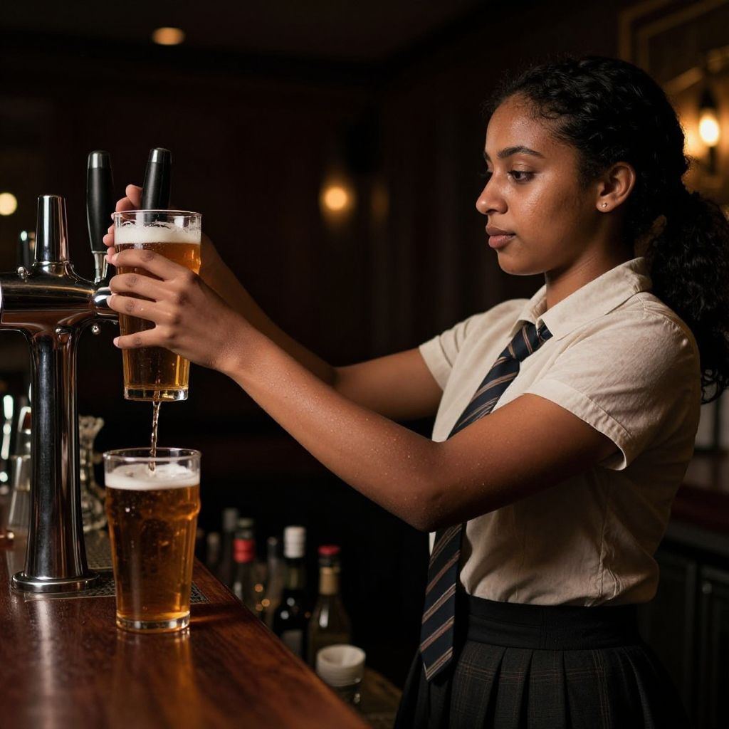 Photograph of a young Black woman with dark, curly hair tied back, wearing a white short-sleeved shirt, black tie, and black pleated skirt, resembling a school uniform. She is pouring beer from a tap into a glass, with another full glass of beer on the wooden bar counter in front of her. The background is dimly lit with warm, ambient lights, and various liquor bottles are blurred in the background. Her focused expression and the glossy texture of the beer glass are prominent. The setting appears to be a cozy, intimate bar.