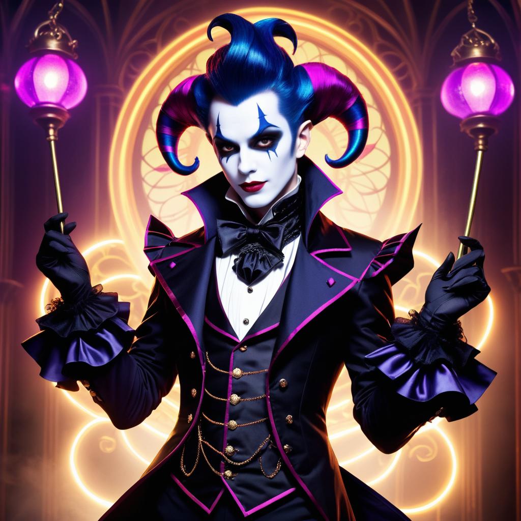 TCG Artwork. A flamboyant male jester wearing a tailcoat with oversized buttons and frilly cuffs with elaborate gothic with dark eyeliner and dramatic lipstick, captured in electric strobe lights.