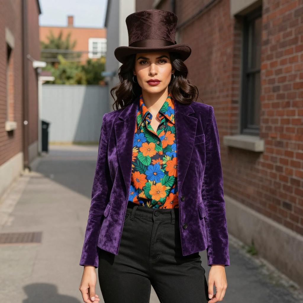 Photograph of a woman with medium-dark wavy hair, wearing a dark brown top hat, a vibrant floral shirt with orange, blue, and green flowers, and a deep purple velvet jacket. She's also wearing black high-waisted pants. The background features a narrow alley between red brick buildings with some greenery visible in the distance. The sunlight casts sharp shadows, highlighting the rich textures of her outfit.