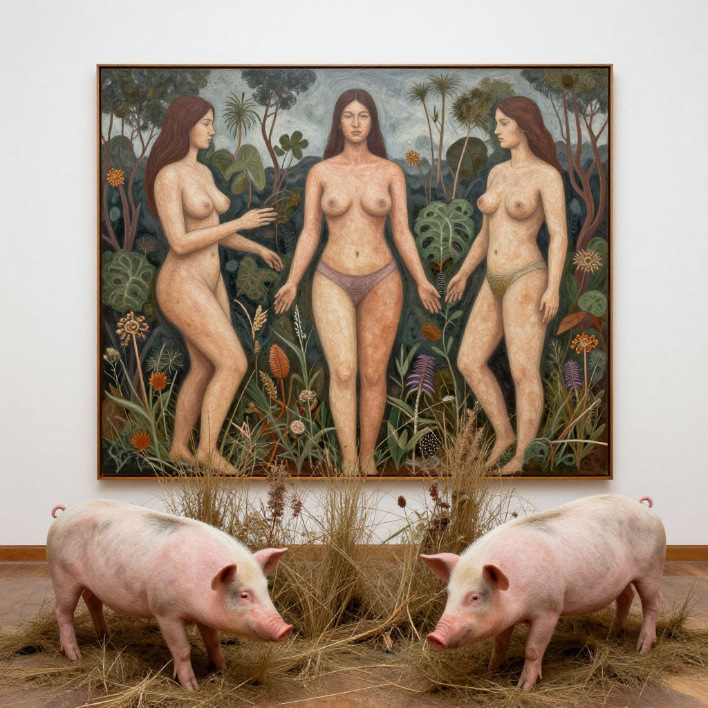 Photograph of a painting depicting three topless women with natural body types in a jungle, standing between two pink pigs on a hay-covered floor in a