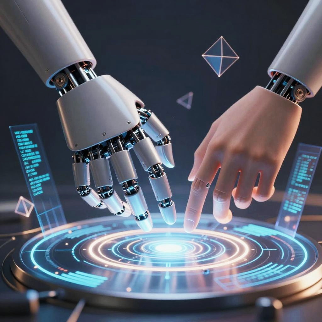 Ai art hands emerging from a holographic interface, robotic and human fingers blending seamlessly, surrounded by floating geometric shapes and digital code, soft light reflections on metallic surfaces, hyper-detailed cybernetic textures