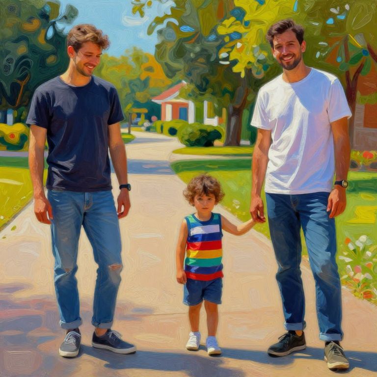 This is a vibrant, digitally painted photograph of a family of three standing on a sunny, tree-lined sidewalk. The father on the left wears a black T-shirt and blue jeans with black sneakers, the taller, bearded father on the right sports a white T-shirt and blue jeans with black shoes. Their curly-haired, smiling toddler in the center wears a sleeveless, rainbow-striped shirt, blue shorts, white socks, and black shoes. They stand close together, holding hands. The background features lush green trees, a clear blue sky, and a colorful, small house with a red roof in the distance. The image has a bright, almost cartoon-like style with bold, vivid colors and soft, blurred edges.