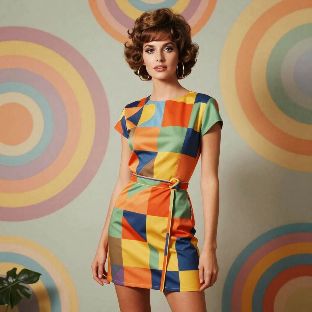 Sexy sixties style fashion shoot, model in vibrant mod mini dress with bold geometric patterns, large hoop earrings, voluminous bouffant hairstyle, posing confidently against a colorful psychedelic background, soft natural lighting, vintage Vogue aesthetic