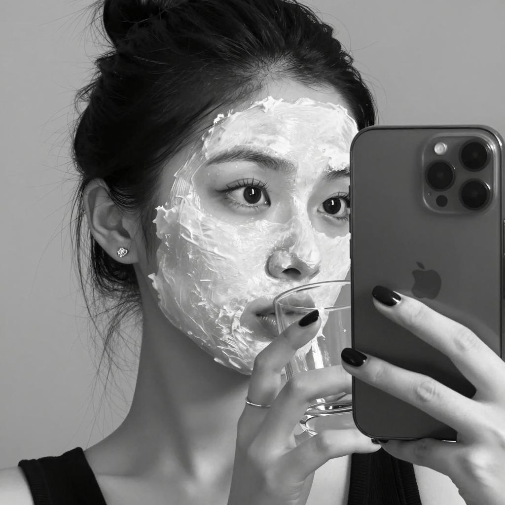 Black and white selfie of a woman with fair skin and dark hair in a bun. Her face is covered in a thick white face mask, with black-painted nails holding a glass near her mouth. She has large eyes, thick eyelashes, and is wearing a diamond earring. She holds a smartphone in her right hand, which partially covers her face. She wears a ring on her right index finger.