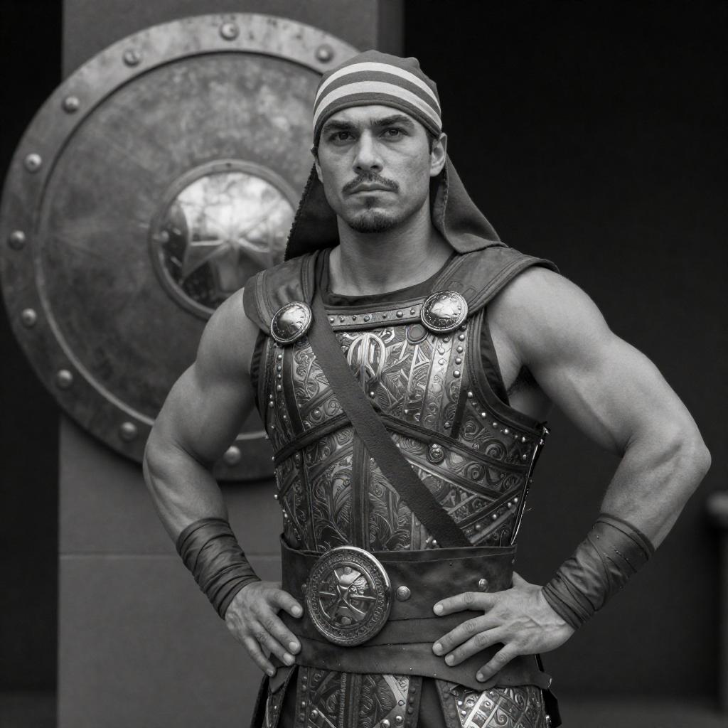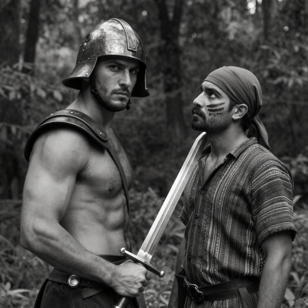 Black-and-white photograph of two men in a forest. Left man with muscular build, helmet, and shoulder armor, holding sword, intense gaze. Right man with patterned shirt, headband, and facial markings, looking up at left man. Dense foliage background.