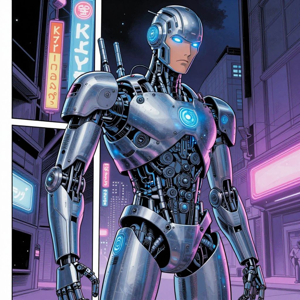 Human robot cartoon exploring a neon-lit cyberpunk street, intricate robotic details with sleek human elements, glowing blue and purple lights highlighting metallic surfaces, moody urban environment, detailed comic panel aesthetic with energetic line work.