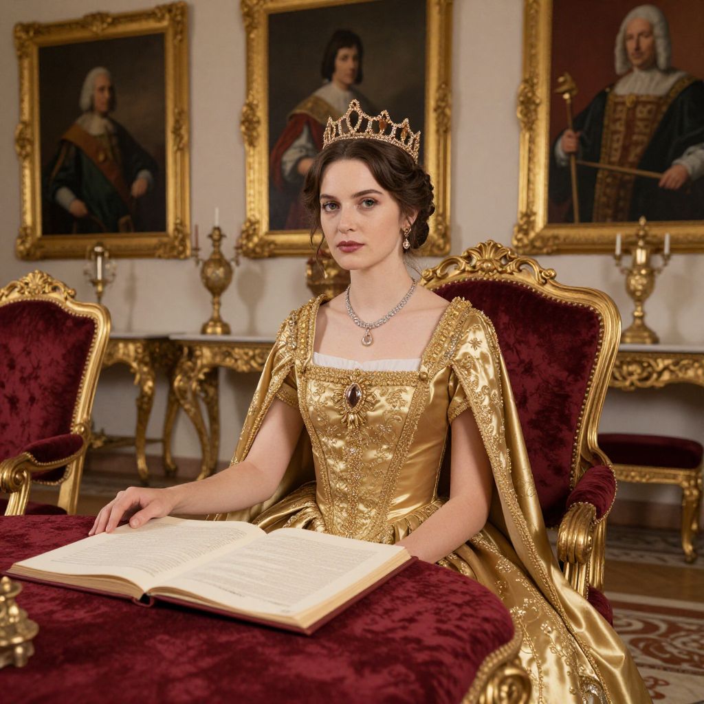 Elegantly seated in a regal chamber, a woman adorned in a luxurious golden gown with intricate embellishments and a crown rests her hand on a red velvet chair, while a document lies open on a matching table beside her, framed by portraits of historical figures on the walls.